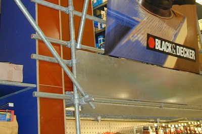 Detail im Baumarkt. Rohrkonstruktion aus Aluminium oder Stahl mit Rohrverbinder.